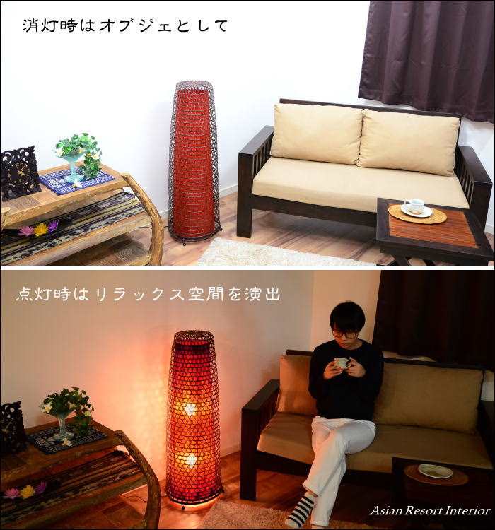 製造国: インドネシア(シェード部分) 日本(ソケット部分) サイズ: 最大径37cm × 高さ105cm 素材: ラタン,布,アイアン 電球:40W(E26) 2個 ※LED電球対応しております。