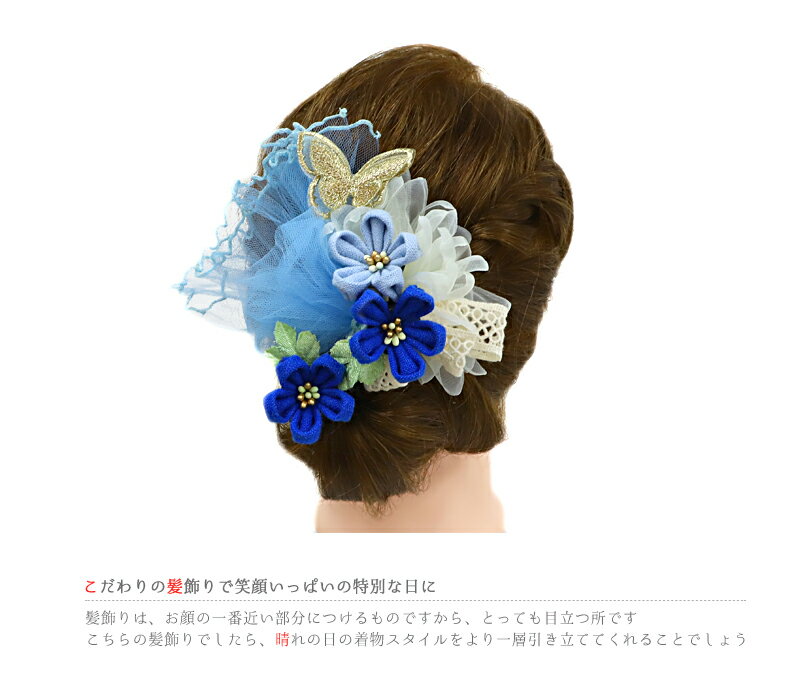 髪飾り 成人式 前撮り 振袖 袴 2点セット 花 白 オフホワイト 青 水色 金 ちりめん つまみ細工 リボン レース 蝶 ちょうちょ りぼん かんざし 簪 和 和装 日本製 レトロ 古典 おしゃれ 大きい 可愛い 大人 大人可愛い 粋 ヘッドドレス ヘアアクセ 卒業式 結婚式 入園式 卒園式 謝恩会 七五三 浴衣 パーティー お祭り ハンドメイド 手作り No.9-5110 サイズ表 ≪コーム飾り≫ 縦 約14cm × 横 約15cm × 高さ 約5.5cm ≪Uピン飾り≫ 縦 約4cm × 横 約5cm × 高さ 約2.5cm ※飾り部分のみ計測しています。