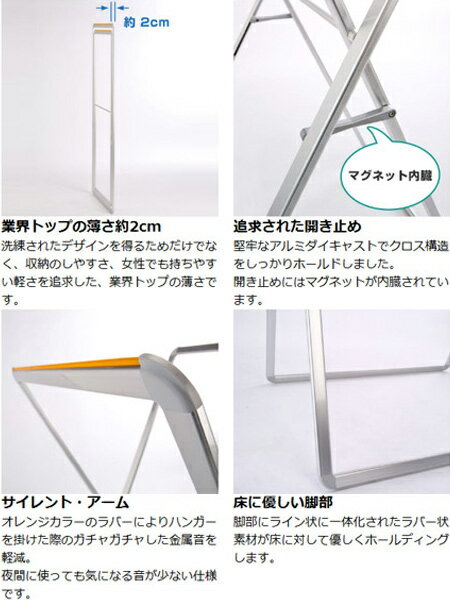 商品区分物干しカテゴリから探す業界トップの薄さ約2cm洗練されたデザインを得るためだけでなく、収納のしやすさ、女性でも持ちやすい軽さを追求した、業界トップの薄さです。