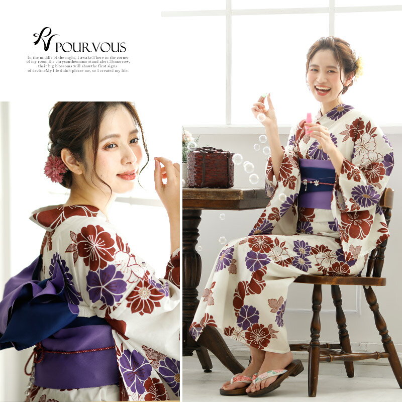 商品仕様 ◆4点セット(浴衣/着付け本/半巾帯/下駄:フリーサイズ23cm〜25cm) ◆浴衣素材:綿100%、帯素材:ポリエステル100% モデル参考 備考 ※浴衣の【しつけ糸】を切った場合は、【返品交換不可】となります。