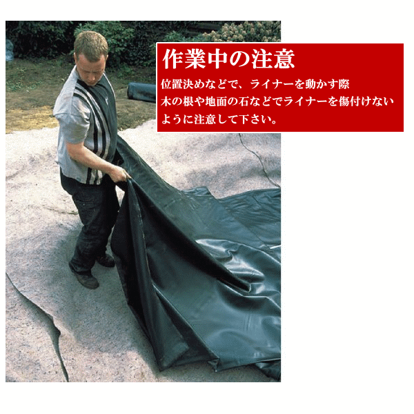 4.アンダーライナーを敷く 石や木の根など突起物をすべ て取り除き、土や砂などで平ら にならした穴にアンダーライナ ーを敷き、ライナーに穴を空け てしまう恐れのある木の根など を防ぎます。