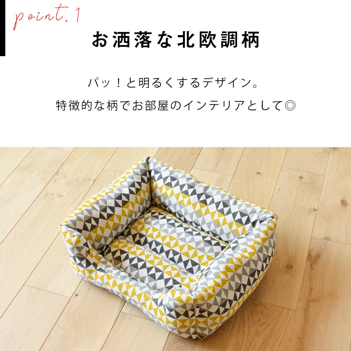 滑り止め加工あり/手洗い可能/小型~中型ペット向け/犬猫OK/北欧調デザイン [ サイズ ] (縦)約38cm×(横)約47cm×(高さ)17cm [ 重量 ]約860g [ 素材 ] 表地:ポリエステル100% 中材:ポリエステル100% 底地:ポリエステル100% [ 生産国 ] 中国 ※お使用いのモニターや部屋の照明により実際の商品とは色味が異なる場合があります。